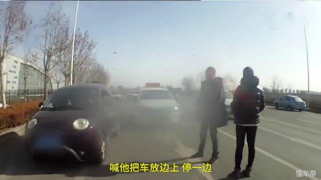 男子不仅将车停在马路中间挡住考试车,他还和一名女子一起挡在了考试车前。